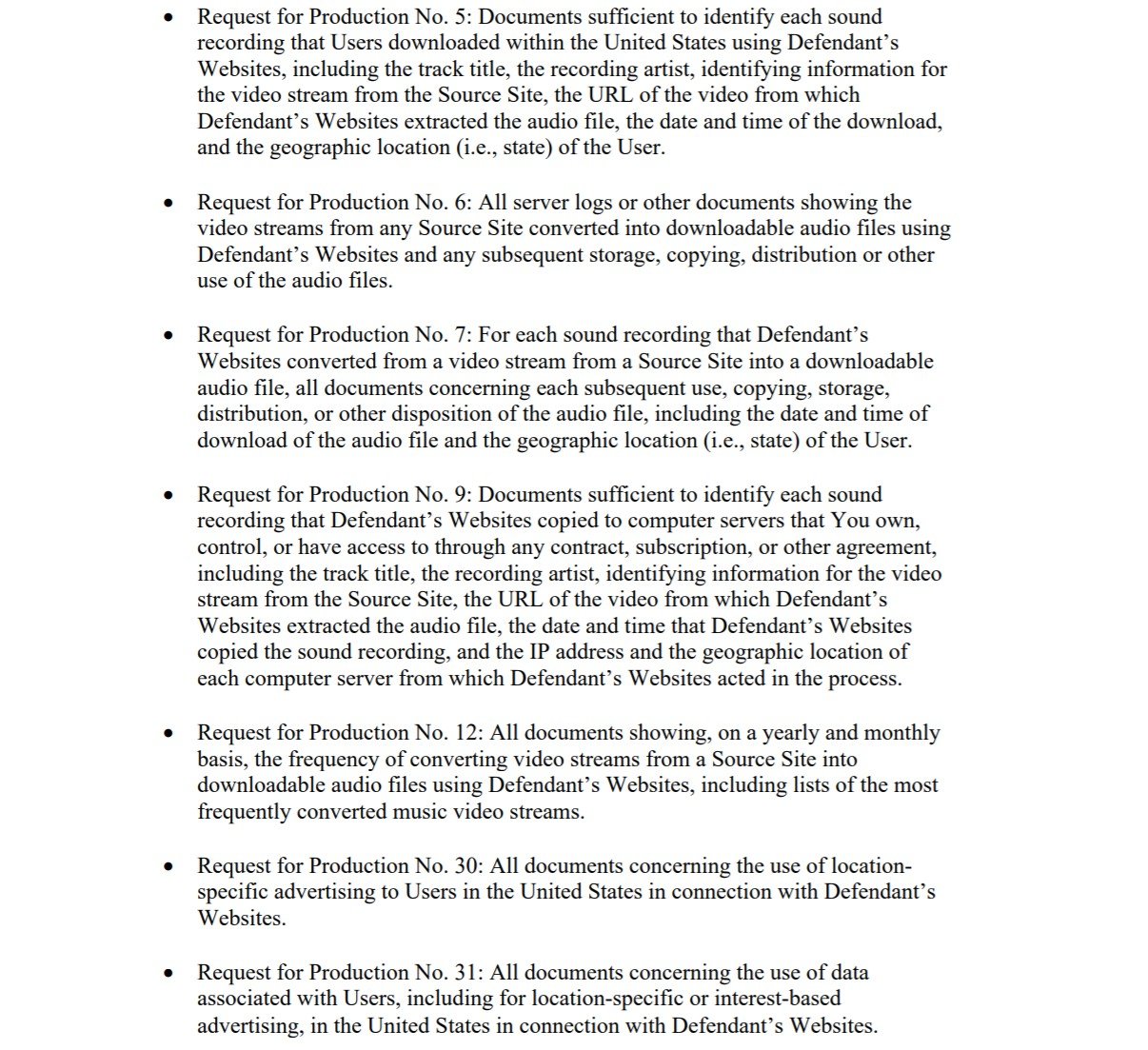 In addition, Mr. Kurbanov is required to produce more general statistics such as the most frequently converted music video streams per month and year. The labels likely expect that their copyrighted works are on these lists.