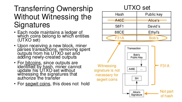 How does the above description change under Segwit? To begin, I’ll quote Dr. Rizun: “In a Bitcoin, the signatures are an integral part of the chain. Carol can only verify the complete chain of ownership if all the signatures exist because if even a single signature is missing, the chain breaks down…there’s no way to follow it through. A Segwit coin is different because the signatures are all outside of the chain. If even none of the signatures exist, or maybe none of the signatures were even real to begin with, Carol can still validate the chain of custody. I’m using the word custody instead of the chain of ownership, because Segwit really only shows custody.”