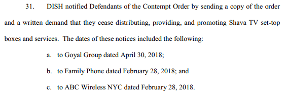 According to Dish, the defendants continued to sell and promote Shava TV despite multiple demands to cease the activity. This, despite the fact that a contempt order issued in the original Shava TV case specifically forbids them from doing so.