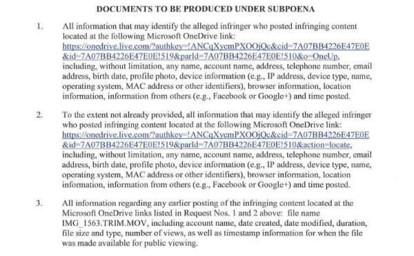 It asks Microsoft to hand over any relevant information that can help to identify the account holder who uploaded the video, which was added to OneDrive back in June.