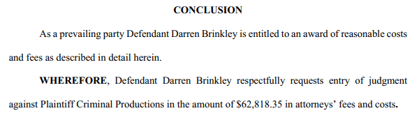 The above is quoted from a recent motion for attorney fees, because things changed significantly when Brinkley lawyered up. While Criminal Productions initially refused to let the case go, recently it voluntarily dismissed the case.