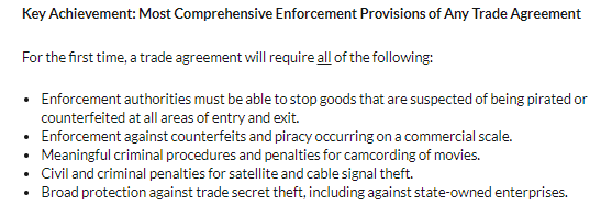 One of the key achievements, according to the US, is that the new deal includes the most comprehensive enforcement provisions of any trade agreement. The final wording has yet to be released, but a summary of the Intellectual Property chapter shows what’s in store.