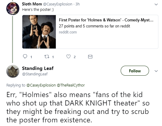 “Err, ‘Holmies’ also means ‘fans of the kid who shot up that DARK KNIGHT theater’ so they might be freaking out and try to scrub the poster from existence,” Twitter user Standing Leaf writes.
