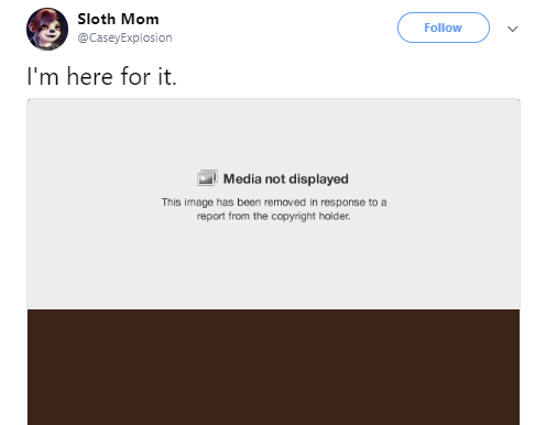 The unusual takedowns haven’t gone unnoticed. Twitter user Sloth Mom has been particularly vocal after one of her tweets was targeted.