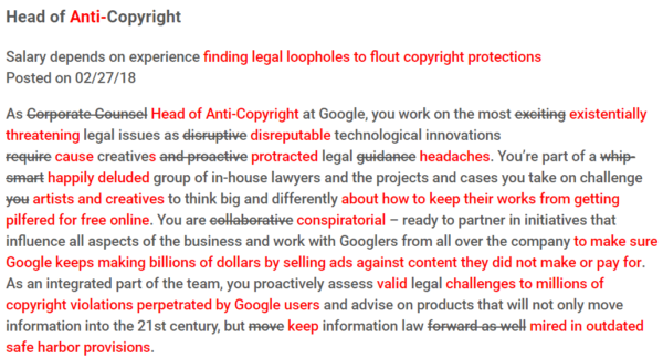 “We have taken the liberty of making these edits for you, presented below as red-lined corrections to the original document. Though the job posting has since been closed online, we trust you will make whomever steps into the role aware of the suggested changes, so that they may conduct their work with Google’s usual high regard for creative professionals and the security of their works in the digital space.”
