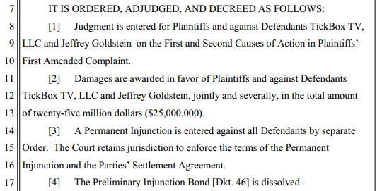 “Damages are awarded in favor of Plaintiffs and against Defendants TickBox TV, LLC and Jeffrey Goldstein, jointly and severally, in the total amount of twenty-five million dollars ($25,000,000).”