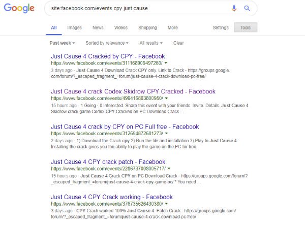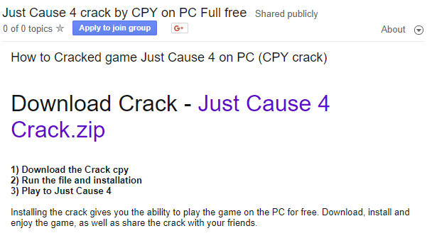 Initially, the Facebook posts linked directly to the sites where the malware-content could be downloaded, but more recently they switched to Google groups. Perhaps because these links are harder to detect automatically.