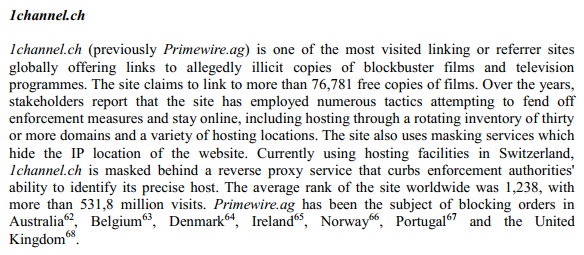 “1channel.ch (previously Primewire.ag) is one of the most visited linking or referrer sites globally offering links to allegedly illicit copies of blockbuster films and television programmes,” it reads.