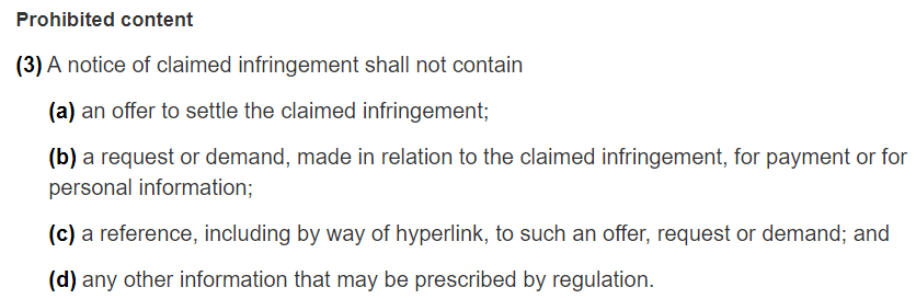 “At the same time, we are urging the introduction of measures in the Copyright Act to end this practice – such as monetary penalties applicable to rightsholders who issue notices that include settlement demands or other prohibited content.”