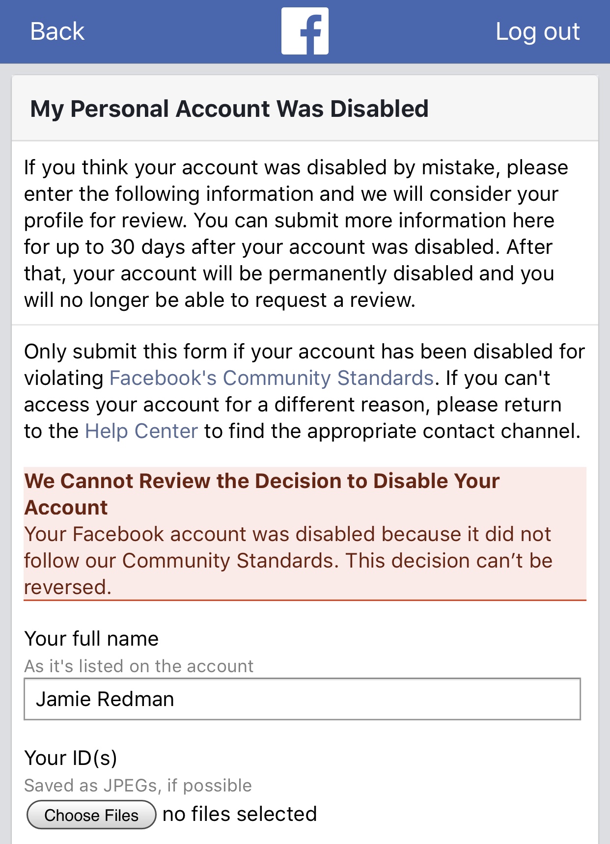 Before my account was deleted, I managed 15 libertarian-based pages, had close to 5,000 friend connections, and moderated six cryptocurrency groups. On Friday morning, the account was completely disabled and was given no access to my FB profile data.