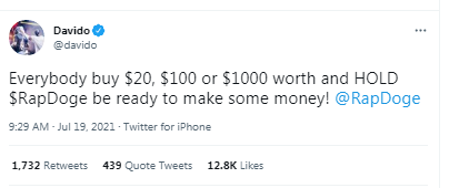 The Nigerian pop artist and celebrity, Davido, recently posted several tweets endorsing ‘rapdoge,’ the so-called “first deflationary meme token fully supported by celebrities & rappers.” In one of the tweets, Davido tells his 9.5 million followers to “buy $20, $100 or $1000 worth of rap doge tokens and be ready to make some money.”