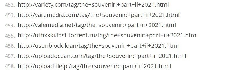 In a series of quite unusual DMCA notices the company reported more than 100,000 URLs that flagged non-existing links on pirate sites. These URLs pointed to hundreds of domains and often used repetitive keyword strings, such as the examples shown below.
