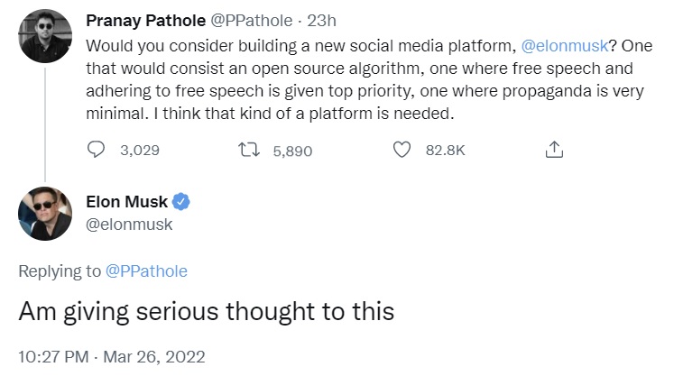 Replying to a question about whether he would consider building a new social media platform with an open source algorithm, where free speech is given top priority and propaganda is minimized, Musk replied: “Am giving serious thought to this.”