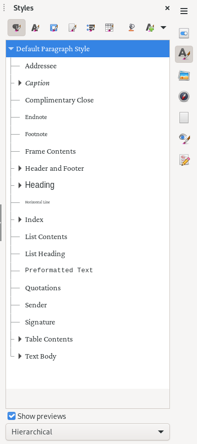 When I’m writing a print edition of a book, I need to prepare the document for double-sided printing, with Left and Right pages. That means my materials need to use the Left Page and Right Page styles for the body pages, and the First Page style for the cover page. So after I modify the document’s default page style, I need to do the same for the First Page, Left Page, and Right Page styles. The first time you edit these page styles, they will inherit the page size from the default, so you only need to modify the page margins to your preferred style. For documents with Left and Right pages, you might instead provide the 1.25″ margin only on the “outside” margins: the right side for Right pages, and the left side for Left pages.