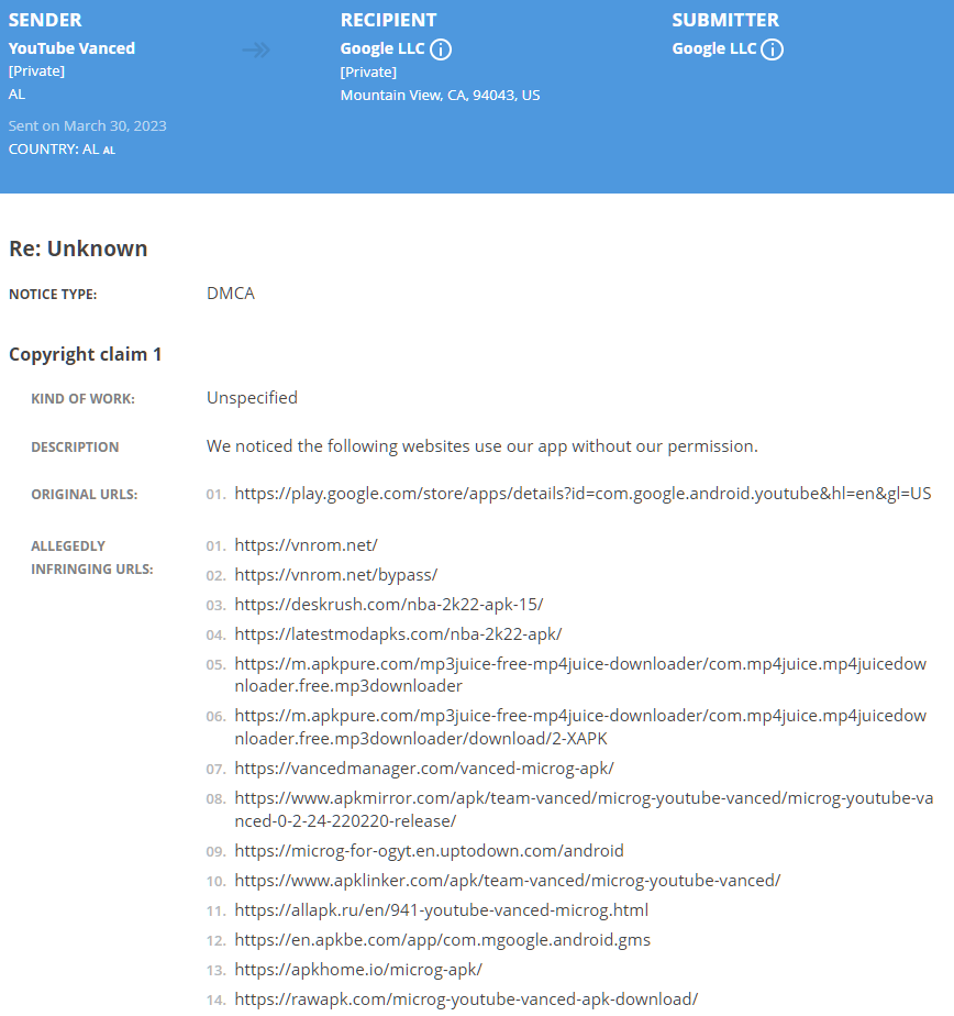 Others, including this one sent by ‘copyright owner’ YouTube Vanced, whoever that is, listed the official YouTube app on Google Play as the original content infringed, before attempting to take down links related to microG and/or Vanced-type software.