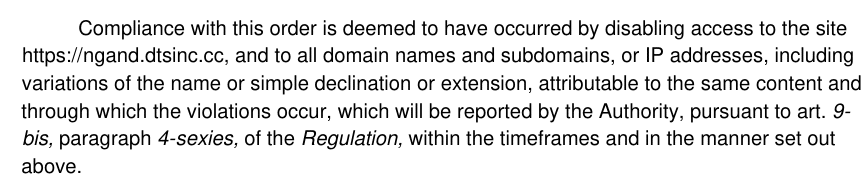 “The applicant has also requested that the recipients of this provision proceed, through subsequent reports, to block any future domain names, subdomains, or IP addresses, including variations of the name or simple declination or extension, attributable to the same content and through which the violations occur,” AGCOM noted as it gave the request the green light.